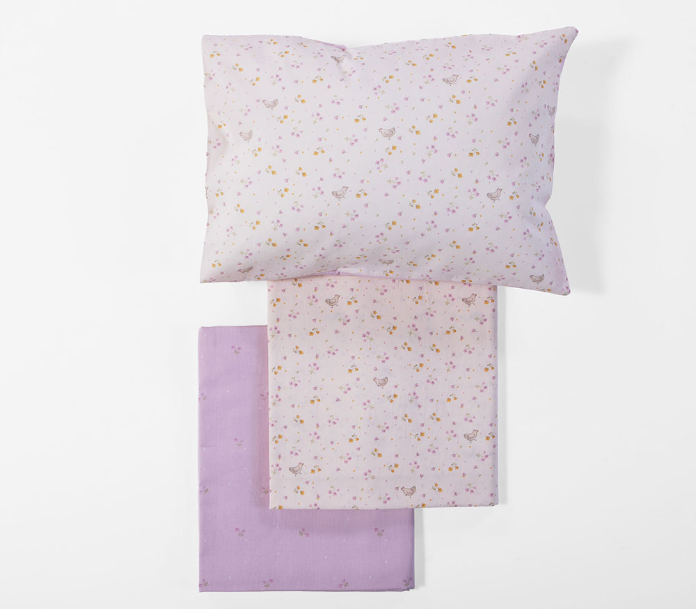 Το σετ περιλαμβάνει ένα κατωσέντονο και ένα πανωσέντονο διάστασης 120x170cm και μία μαξιλαροθήκη διάστασης 30x40cm.
