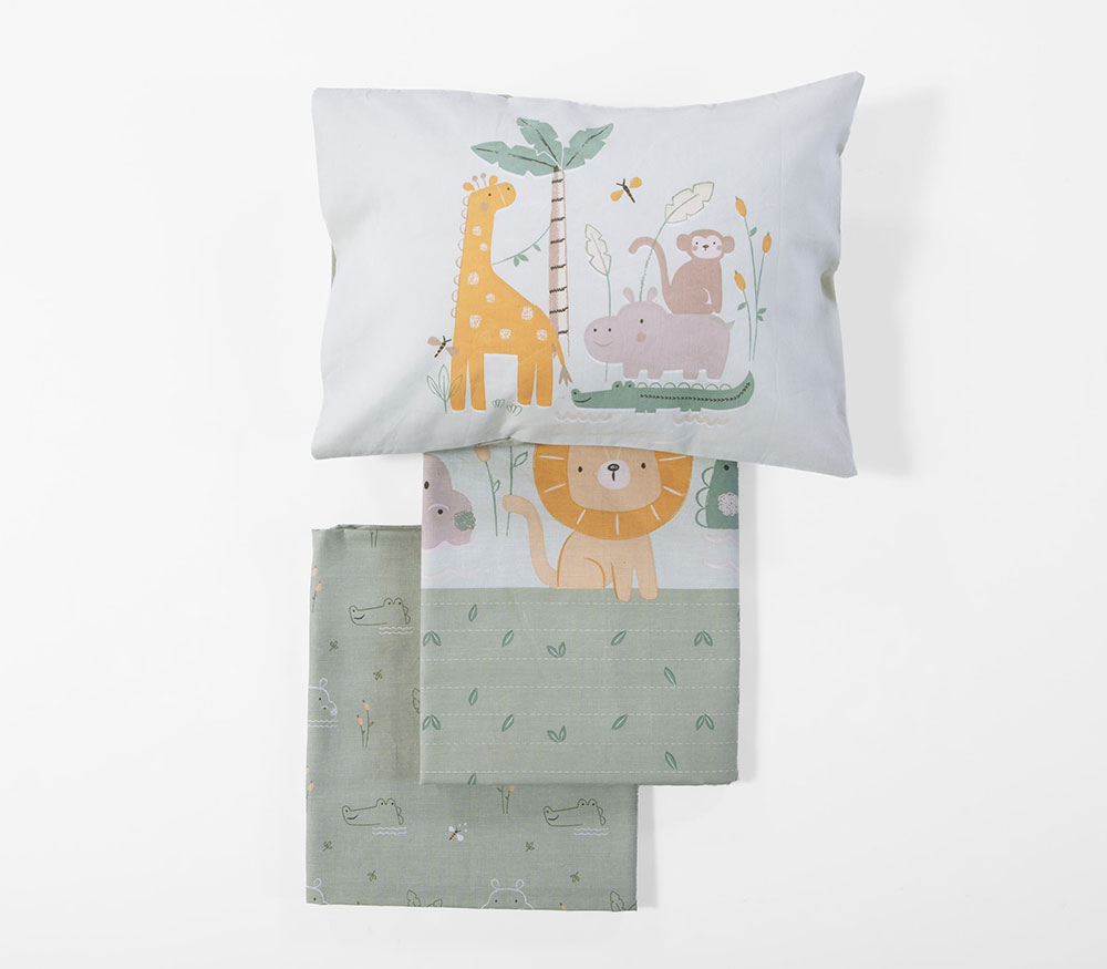 Το σετ περιλαμβάνει ένα κατωσέντονο και ένα πανωσέντονο διάστασης 120x170cm και μία μαξιλαροθήκη διάστασης 30x40cm.